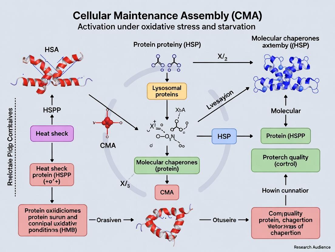 The activation of CMA under oxidative stress and starvation represents a sophisticated, selective cellular defense mechanism critical for maintaining proteostasis and viability. This review has synthesized the molecular triggers, methodological tools, experimental nuances, and comparative context essential for advancing CMA research. The unique ability of CMA to selectively degrade damaged or regulatory proteins positions it as a pivotal therapeutic target. Future research must focus on developing highly specific pharmacological CMA modulators, understanding the long-term consequences of CMA manipulation in vivo, and translating these insights into clinical strategies for combating aging, neurodegenerative diseases, and metabolic syndromes. Bridging the gap between fundamental mechanistic discovery and therapeutic application remains the paramount challenge and opportunity in this dynamic field.