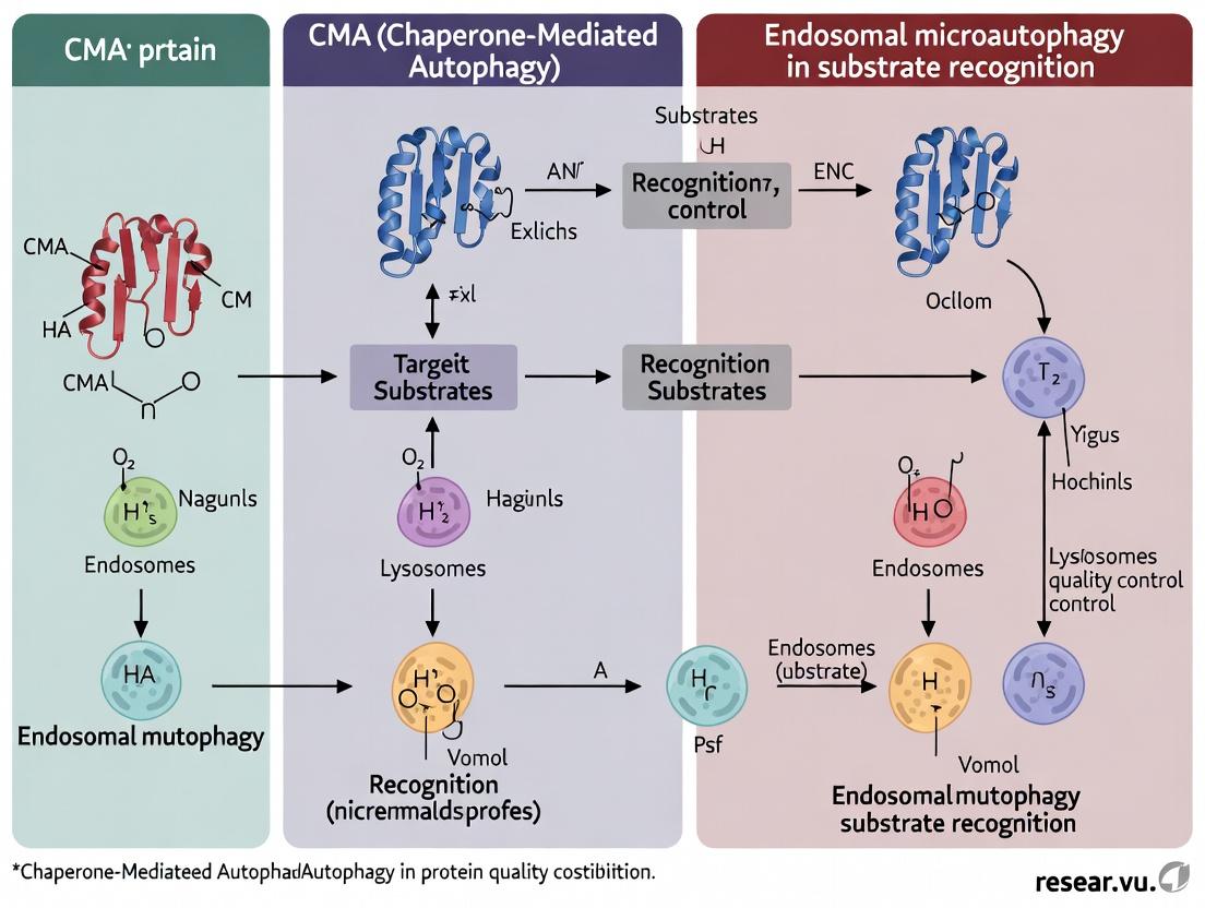 This article provides a comprehensive analysis of the distinct molecular mechanisms underlying substrate recognition in Chaperone-Mediated Autophagy (CMA) and Endosomal Microautophagy (eMI). Tailored for researchers and drug development professionals, we explore the foundational biology of each pathway, detail state-of-the-art methodological approaches for their study, address common experimental challenges, and present a comparative validation of their selective roles in proteostasis and disease. The synthesis aims to illuminate how targeting these specific recognition systems could inform novel therapies for neurodegenerative diseases, cancer, and aging-related disorders.