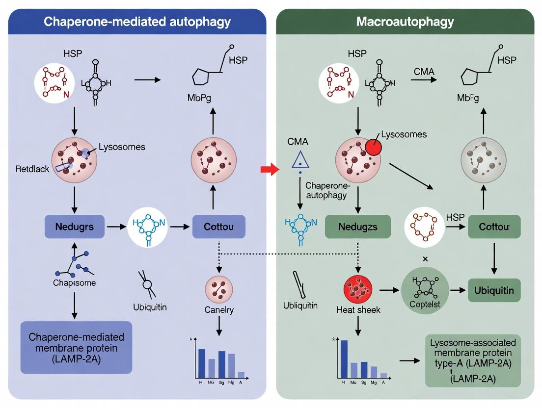 Within the field of protein degradation research, a critical thesis examines the comparative roles of Chaperone-Mediated Autophagy (CMA) and macroautophagy. While macroautophagy engulfs large cargo in double-membraned vesicles for lysosomal delivery, CMA directly translocates specific cytosolic proteins across the lysosomal membrane. Understanding their functional redundancy and compensatory mechanisms when one is impaired is vital for developing targeted therapies.