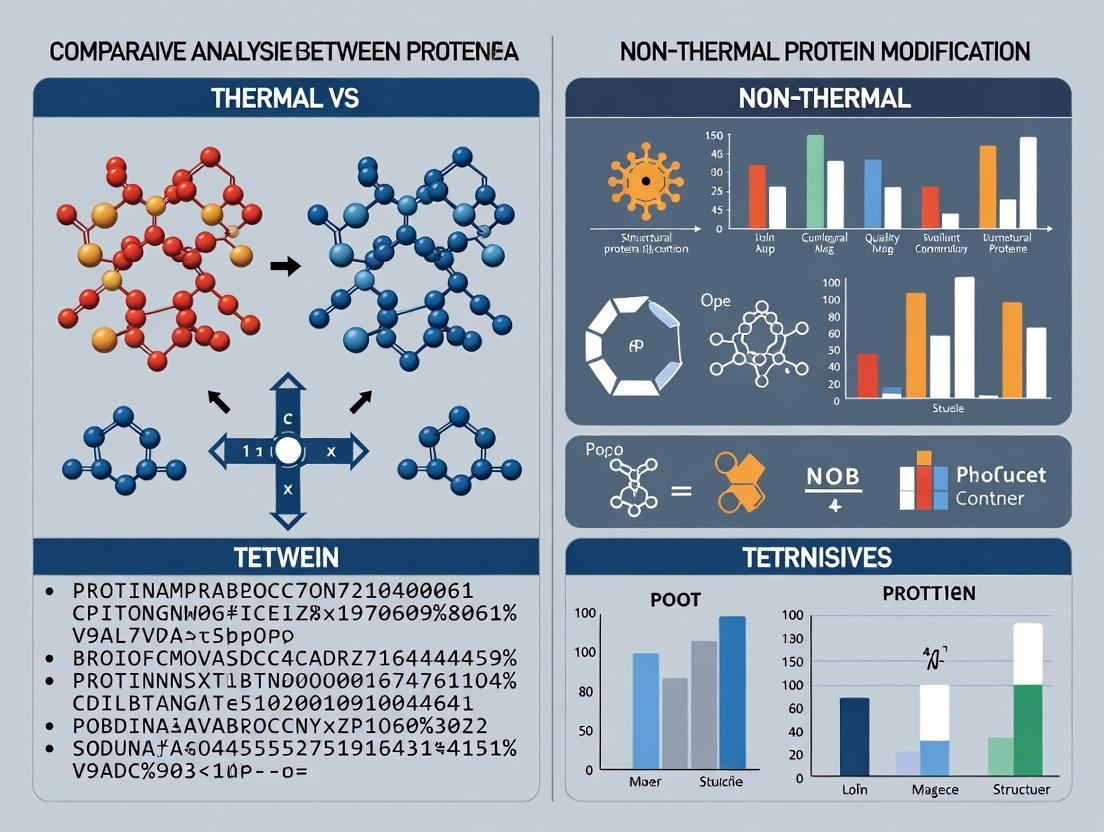 This guide provides a comparative analysis of thermal and non-thermal protein modification techniques, central to modern biopharmaceutical development. Thermal methods rely on kinetic energy from heat, while non-thermal techniques induce modification through mechanisms like electrical, pressure, or radiative energy without bulk heating. This comparison is framed within a thesis on their distinct mechanisms, applications, and outcomes in protein engineering and drug development.