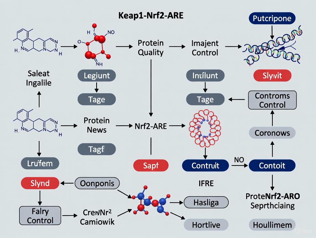 The Keap1-Nrf2-ARE pathway is intrinsically linked to cellular protein quality control. Key Nrf2 target genes include those encoding for proteasome subunits and autophagy receptors, creating a direct molecular bridge to the clearance of misfolded proteins [73]. Furthermore, the protein p62/sequestosome-1, a key selective autophagy receptor, plays a pivotal role at this intersection. p62 directly interacts with Keap1, competitively disrupting the Keap1-Nrf2 complex and leading to Nrf2 activation [75] [73]. Conversely, Nrf2 activation transcriptionally upregulates p62 expression, creating a positive feedback loop that is critical for cellular adaptation to proteotoxic stress [73]. This intricate crosstalk positions the Keap1-Nrf2 pathway as a master regulator of cellular resilience, capable of enhancing the clearance of toxic protein aggregates implicated in neurodegenerative pathologies.